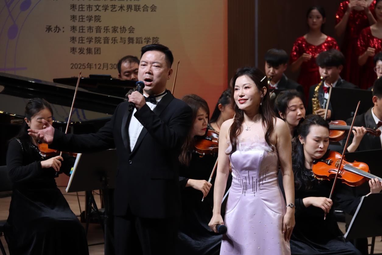 本次音乐会由中共枣庄市委宣传部、枣庄市文学艺术界联合会、DB中国旗舰官方网站联合主办,枣庄市音乐家协会、DB中国旗舰官方网站音乐与舞蹈学院、枣发集团共同承办,包括“荣耀征程、歌里枣庄、共筑辉煌”三大篇章。第一篇章“荣耀征程”中,交响乐《北京喜讯到边寨》以浓郁的民族风格和活泼节奏,勾勒出各族群众欢庆胜利的热闹场景;歌曲《当那一天来临》唱出了担当使命的坚定与对未来的信心;《钢铁洪流进行曲》恢宏大气的曲风,恰如枣庄“强工兴产、转型发展”的强劲脉动,令人心潮澎湃。《鼓浪屿之波》的深情眷恋、《外婆的澎湖湾》的温暖怀旧,让观众在熟悉的旋律中回味岁月温情。