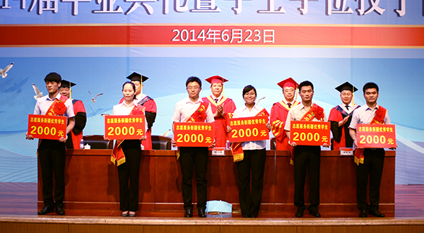 副校长颜世昌宣读了《关于表彰2014届优秀毕业生的决定》,《关于表彰2014年“大学生志愿服务西部计划”优秀青年志愿者的决定》,校领导分别为获奖同学颁奖。