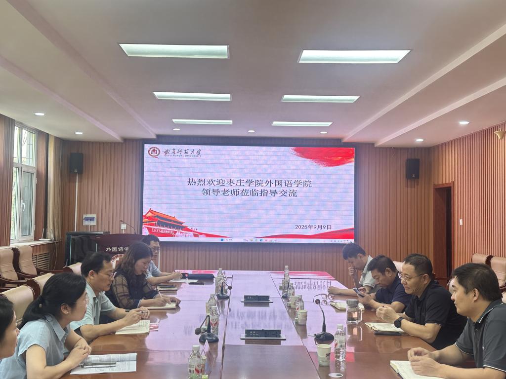 此外,滕聿峰、韩建侠一行与曲阜师范大学外国语学院进行座谈交流。曲阜师范大学外国语学院院长秦洪武、党委副书记王作茂热情接待了滕聿峰、韩建侠一行,并介绍了学院关于翻译硕士点建设、高层次人才引进以及教学科研的相关情况和经验,并为我校申硕工作提出建设性建议。双方就专业建设、教学与科研、人才引进等问题展开深入探讨,并就人才联合培养工作达成了初步共识。