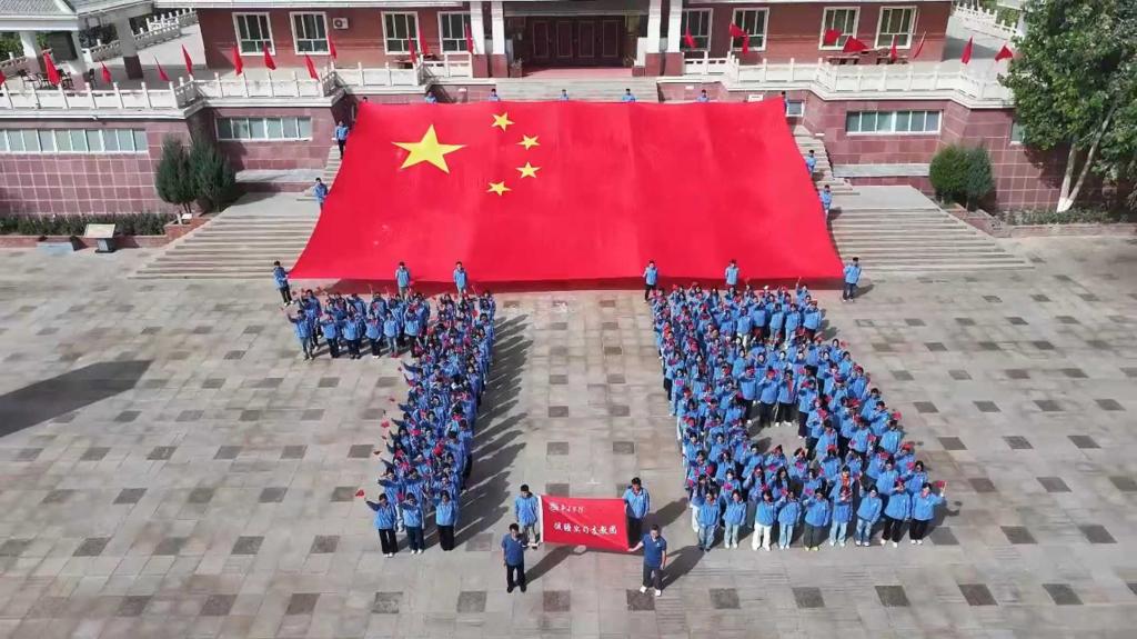 活动中,支教团队员们与东营援疆指挥部领导分工明确、默契配合,迅速完成场地规划与队列调整,用整齐昂扬的青春身影排出“76”巨型数字图案。大家手持鲜艳红旗,齐声高喊“我爱新疆,我爱祖国”,嘹亮口号响彻现场,将对祖国的赤诚与对新疆的热爱展现得淋漓尽致。
