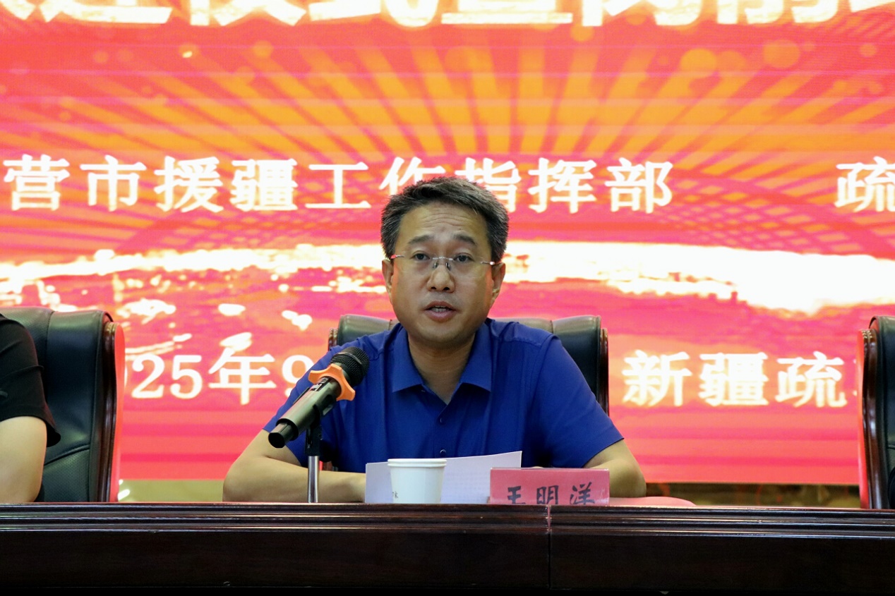 东营援疆指挥部党委书记王明洋在发言中希望支教生尽快完成角色转换,深刻理解援疆工作的政治意义,铸牢中华民族共同体意识,并确保在疆期间的安全与稳定。