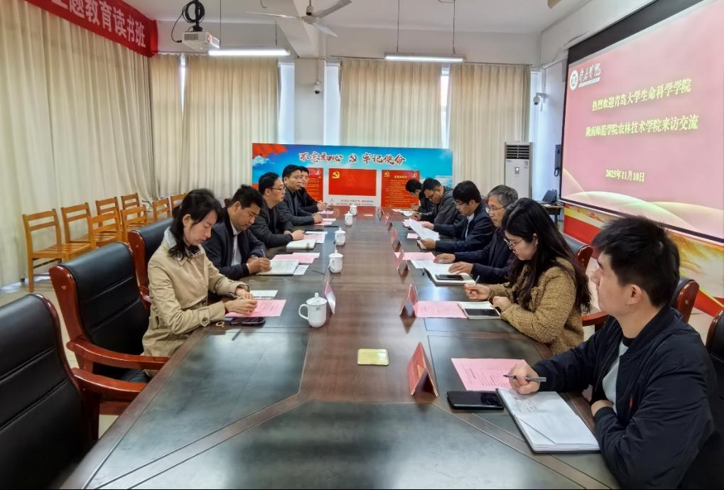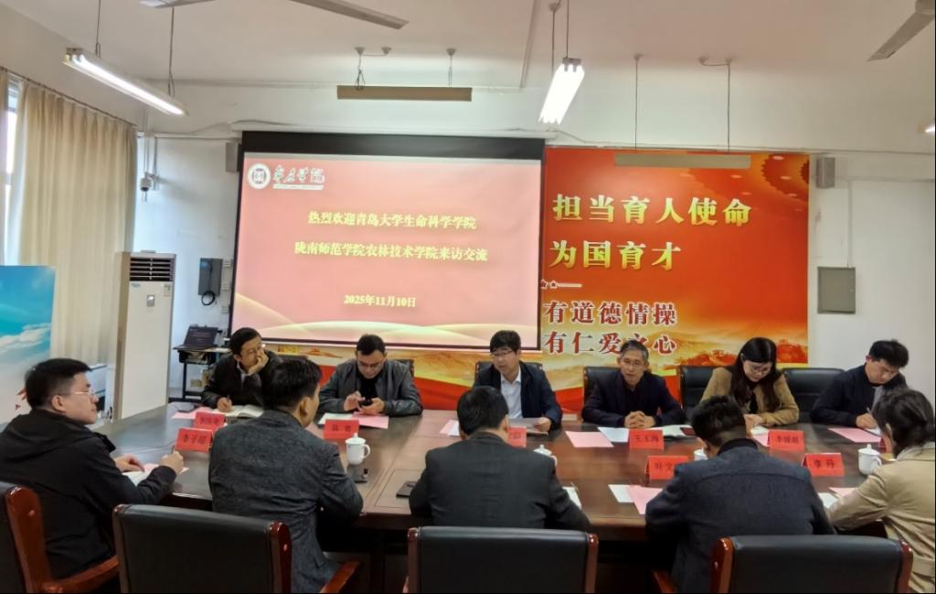 为进一步加强沟通联系,学习借鉴先进经验,共同探讨发展路径,推动学科建设与教学科研水平提升,11月10日上午,青岛大学生命科学学院党委书记孙建华、院长孙海新,陇南师范学院农林技术学院院长叶文斌等一行5人应邀到我校生命科学学院座谈交流。生命科学学院党委书记杨文涛、院长王玉海及教师代表参加了座谈会,会议由王玉海主持。