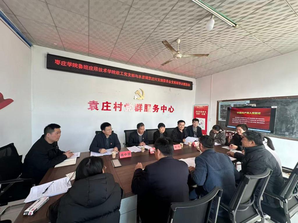为深入学习贯彻党的二十届四中全会精神,加强基层党组织建设,促进校地合作与资源共享,11月28日,鲁班应用技术学院教工党支部与枣庄市山亭区水泉镇袁庄村党支部联合开展支部联学共建暨“学习贯彻党的二十届四中全会精神”主题党日活动。鲁班应用技术学院教工党支部党员代表、DB中国旗舰官方网站驻袁庄村“第一书记”、袁庄村党支部党员干部代表共同参加了此次活动。