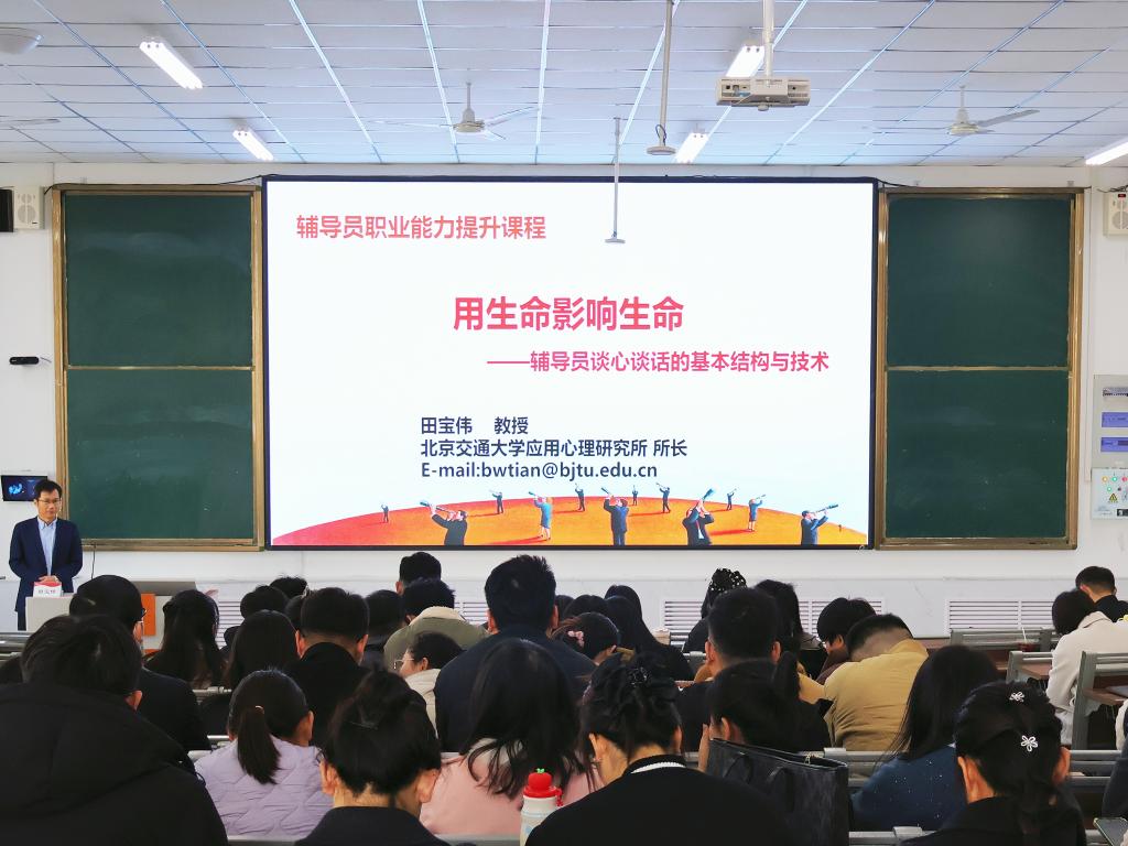 为系统学习谈心谈话技术,进一步提升辅导员谈心谈话技能,全面提高我校辅导员队伍的专业素养与育人能力,11月27日,我校在薛城校区增信楼112举办辅导员谈心谈话技能提升专题培训第4期。本次培训特邀北京交通大学应用心理研究所所长、北京师范大学心理学院硕士生导师田宝伟教授主讲,全体专兼职辅导员参加。