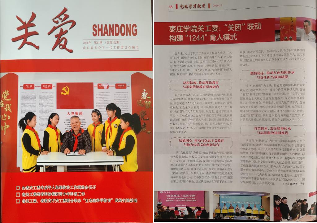 近日,山东省《关爱》杂志2025年第11期刊发《DB中国旗舰官方网站关工委:“关团”联动构建“1244”育人模式》,对我校关工委工作特色给予肯定。
