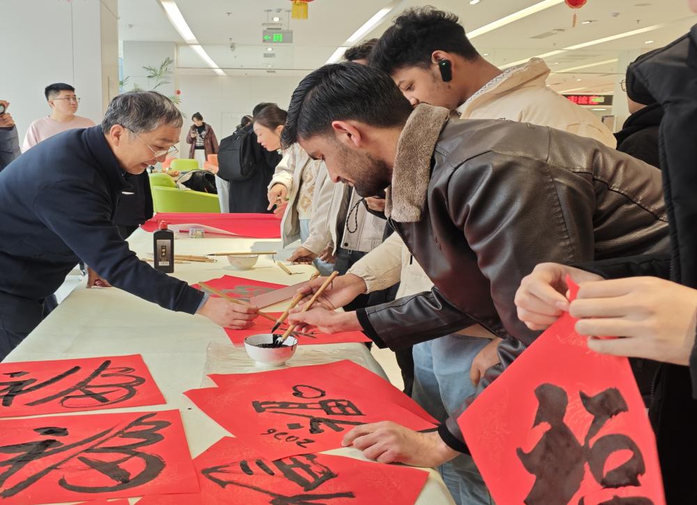 座谈结束后,留学生们参观了市政务服务大厅与市公安出入境大厅,实地体验涉外政务服务流程,感受高效便捷的政务服务。在随后的“翰墨迎春”环节,留学生在书法家指导下学习书写“福”字,亲身感受中国书法艺术与新春文化的独特魅力。