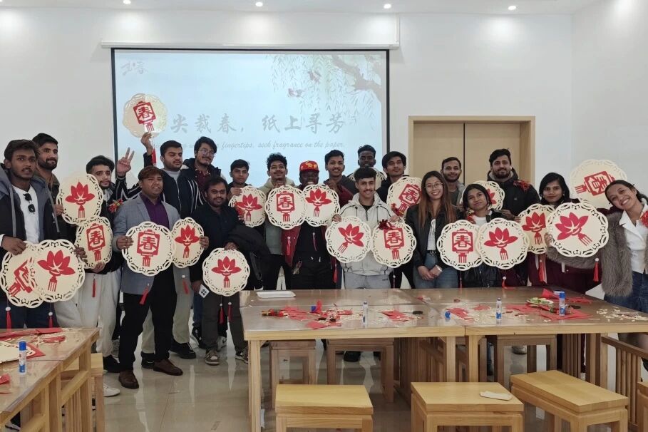 2月4日下午,我校留学生前往枣庄市博物馆开展“枣见世界・二十四节气里的中国”感受立春文化研学活动。在馆内,同学们沿着历史脉络参观文物陈列,聆听立春节气的文化内涵与习俗介绍,并亲身参与剪纸创作及“咬春”、“戴春鸡”等互动体验,在实践过程中深刻感受中华传统文化的魅力。