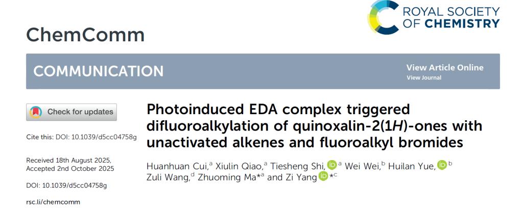 研究成果二:《Photoinduced EDA complex triggered difluoroalkylation of quinoxalin-2(1H)-ones with unactivated alkenes and fluoroalkyl bromides》。本研究开发了一种新颖、实用的光化学方法,用于合成C3-二氟烷基化的喹喔啉酮类化合物。其最大的亮点在于巧妙利用底物自身形成EDA复合物,完全规避了金属催化剂和外源光催化剂的使用,体现了绿色化学和步骤经济性的核心理念。这项工作不仅为含氟喹喔啉酮库的快速构建提供了强大工具,也为其在药物发现和功能材料中的应用开辟了新的可能性。更重要的是,这种基于EDA复合物的催化模式为其他类型惰性化学键的活化与官能团化提供了新的思路和借鉴。崔环环博士为本论文第一作者,DB中国旗舰官方网站为第一完成单位。该研究得到山东省自然科学基金和DB中国旗舰官方网站博士基金等项目支持。