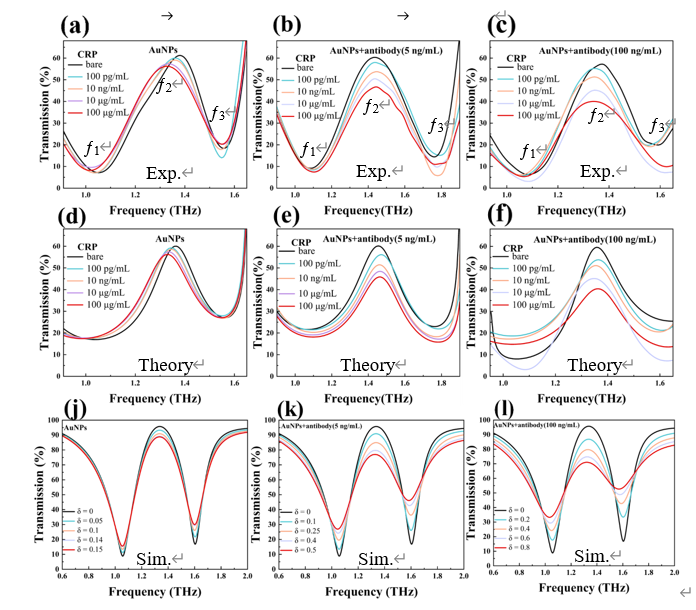 团队成功研发 LSPR 增强型 CRP 抗体功能化太赫兹超表面生物传感器,超表面经 APTES 修饰后固定 15nm 胶体金纳米颗粒(AuNPs),利用 LSPR 效应放大局域电磁场,同时依托其高比表面积提高 CRP 抗体负载密度;结合 BSA 封闭非特异性结合位点,优化抗原捕获效率,构建抗体 - 胶体金纳米颗粒复合传感界面。