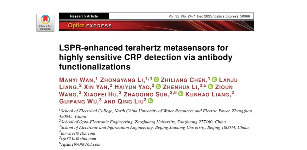 近日,我校光电工程学院微纳制造与太赫兹山东省工程研究中心梁兰菊教授团队与华北水利水电大学李忠洋教授团队联合培养培养硕士万满意以《LSPR-enhanced terahertz metasensors forhighly sensitive CRP detection via antibodyfunctionalizations》为题在《Optics Express》(中科院分区二区)上发表最新成果。