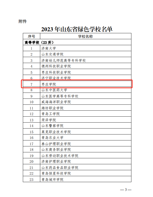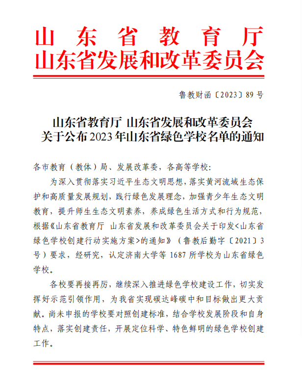 近日,山东省教育厅、山东省发展和改革委员会公布2023年山东省绿色学校名单,我校成功获评“山东省绿色学校”称号。
