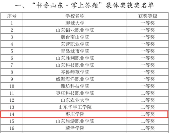 近日,由中共山东省委宣传部、山东省教育厅主办的山东省高校师生“阅读新时代·书香润校园”阅读活动获奖名单公布。在“书香山东·掌上答题”活动中,我校荣获集体二等奖, 师生荣获个人二等奖2项、三等奖9项、优秀奖5项。