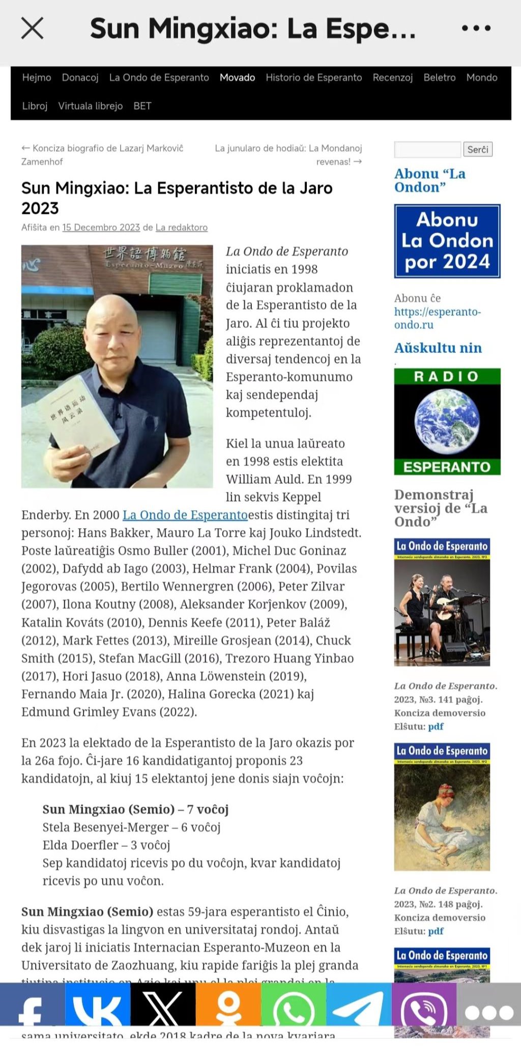在全球世界语界欢度“柴诞节”之际,(12月15日为世界语创造者柴门霍夫诞辰纪念日),我校世界语博物馆建设研究专家孙明孝老师荣获俄罗斯《世界语浪潮》组织评选的全球“2023年杰出世界语者”称号,为中国世界语事业赢得了荣誉。