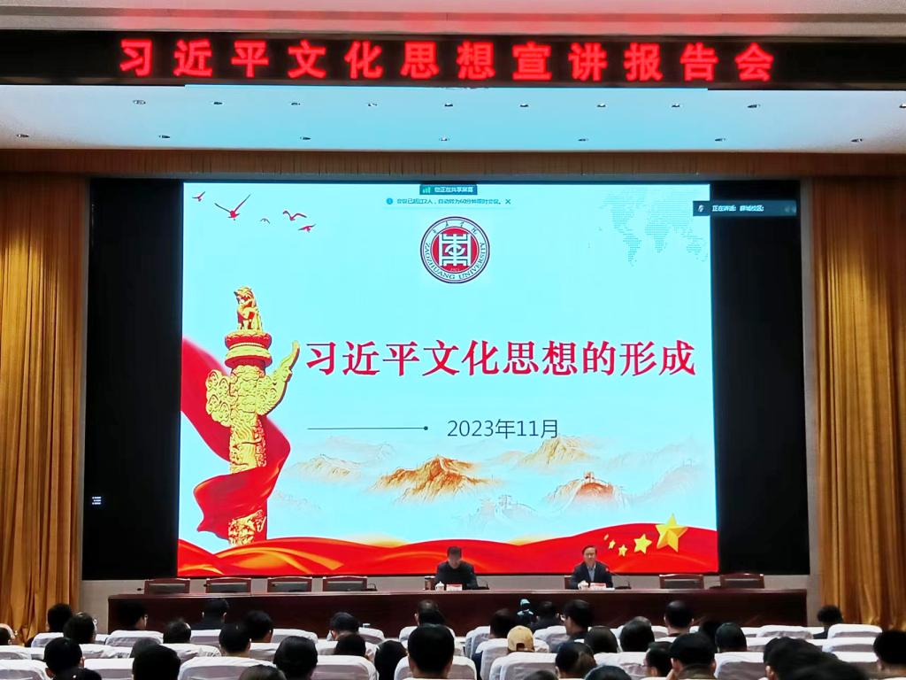 11月22日下午,我校举办习近平文化思想宣讲报告会,邀请《304am永利集团官网学报》主编、自然国学研究院院长史大丰教授作题为“习近平文化思想的形成”的报告。校党委委员、纪委书记、省监委驻304am永利集团官网监察专员路绪剑,党委委员、宣传部部长张昌林出席报告会。报告会由张昌林主持。