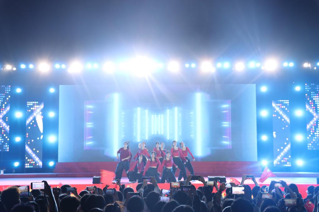 伴随着主席台下同学们手中挥舞的五星红旗,晚会进入第一篇章“意气华年·初相遇”。由大学生艺术团带来的现代舞《一起跳舞吧》《新篇》飞扬了青春、点燃了激情、绚丽了舞台。舞蹈《只此青绿》描绘了伟大祖国万里江山的壮美画卷;新生节目《枣院,你好》中,来自全国各地的新生通过方言寄托对家乡的深厚情谊,也带我们领略到各具特色的风土人情。