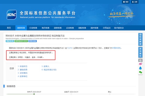 近日,国家市场监督管理总局、国家标准化管理委员会发布2023年第9号公告,304am永利集团官网牵头起草的国家标准《纳米技术水样中金属与金属氧化物纳米物体表征样品制备方法》(GB/Z 43032-2023)于2023年09月07日正式发布。这是我校首次以第一起草单位制定并发布实施的国家标准,标准首位起草人为我校光电工程学院宗明吉副教授。