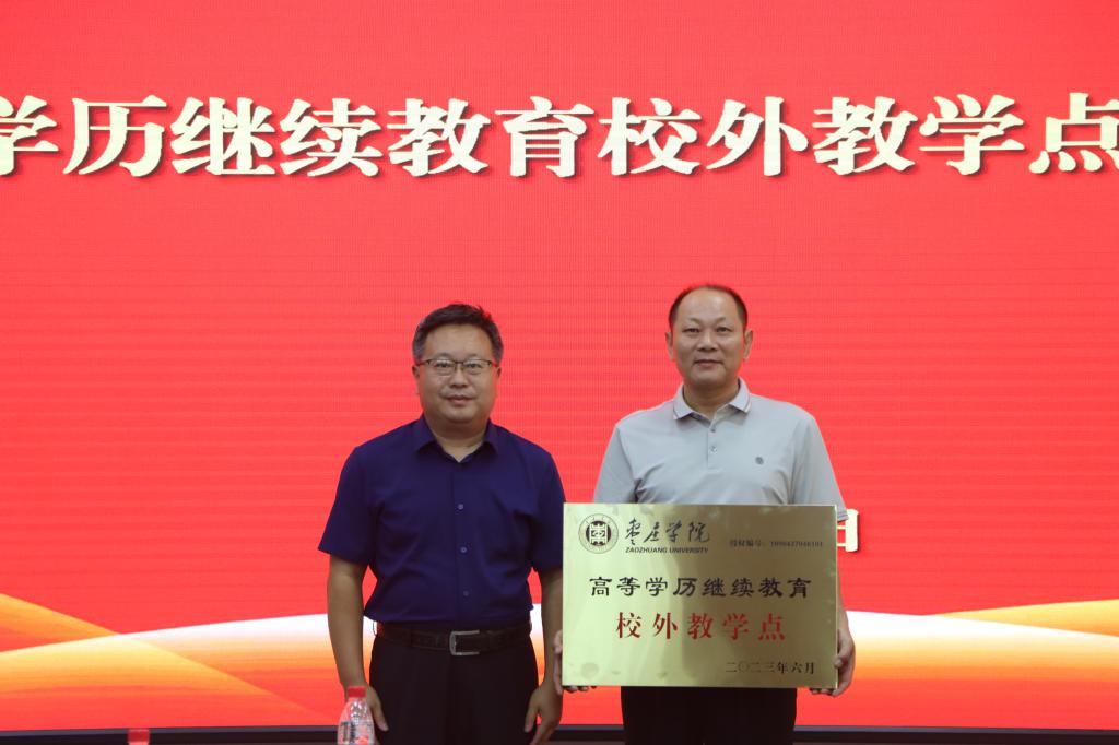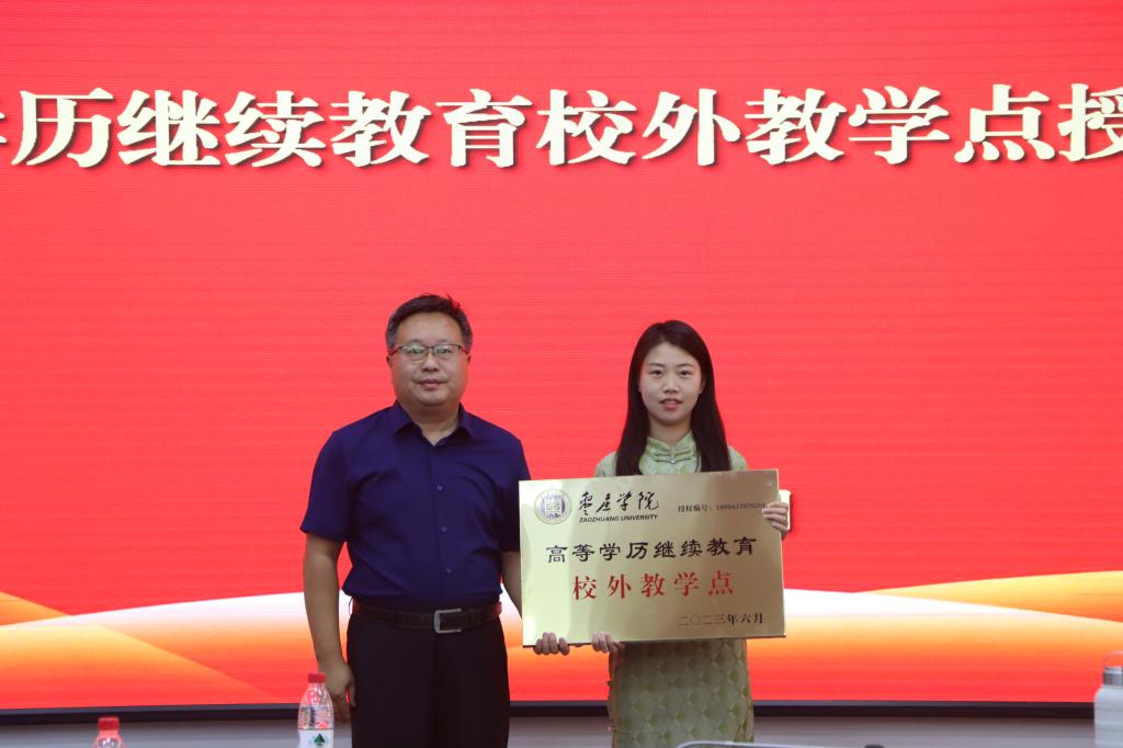 丰雷为校外教学点颁发我校进行授权并编号的高等学历继续教育校外教学点牌匾并合影留念。