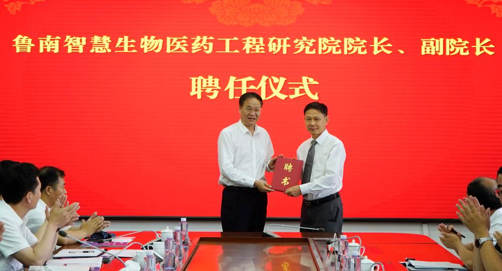 李文喜为鲁南智慧生物医药工程研究院院长、副院长和执行院长颁发聘书。