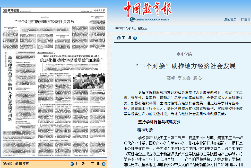 6月14日,中国教育报刊发我校党委书记高峰、校长李文喜署名文章《304am永利集团官网“三个对接”助推地方经济社会发展》。文章报道了我校将服务地方经济社会发展作为开展主题教育,落实“学思想、强党性、重实践、建新功”总要求的实战检验,充分发挥人才与科研优势,加强有组织科研,主动对接地方经济社会发展,通过统筹学科专业布局、培育高水平行业人才、提升科技成果转化效能等举措实现高校科研教学与现实生产力的无缝对接,为地方经济社会发展作出积极贡献。