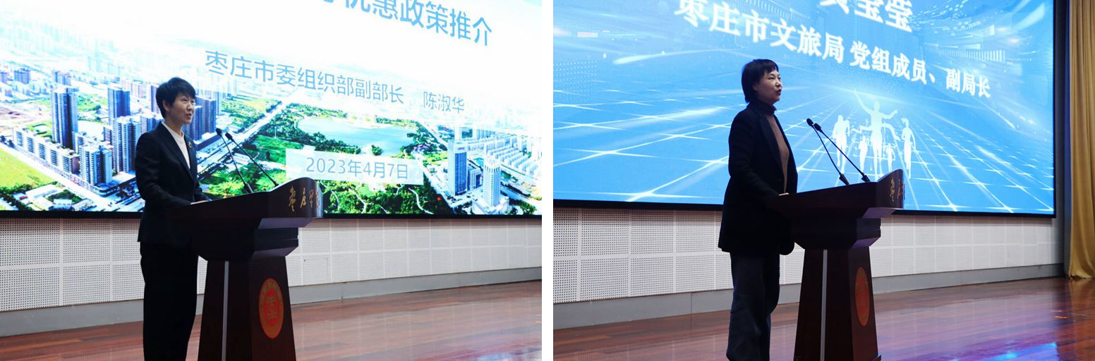 陈淑华从人才计划、创业帮扶、服务保障等三个方面详细推介了枣庄市引才优惠政策。市文旅局党组成员、副局长黄莹莹介绍了枣庄市文化旅游总体情况及《让文物活起来》工作计划。