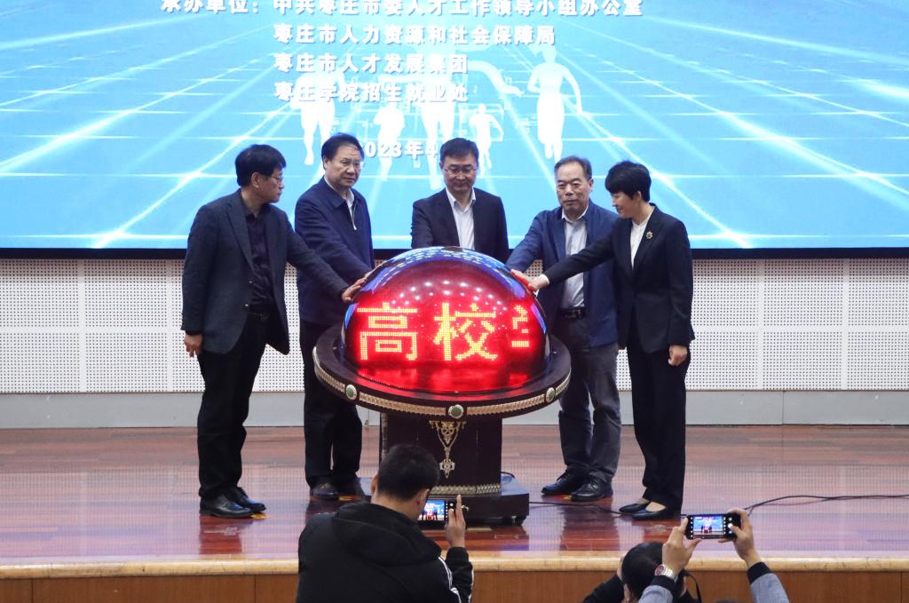 本次活动采取线下线上同步举办、全程直播的方式。枣庄市副市长张庆伟,省“四进”工作枣庄市总队总队长陈承聚、副总队长王鹏,枣庄市委组织部副部长陈淑华,省“四进”工作组枣庄市总队相关人员,市直相关单位负责同志,各区(市)委组织部、人社局分管负责人,企业负责人;校党委副书记、校长李文喜,各二级学院及招生就业处负责人和师生代表参加招聘会。山东城市建设职业学院、山东劳动职业学院师生代表通过网络直播观看。会议由304am永利集团官网党委委员、副校长丰雷主持。