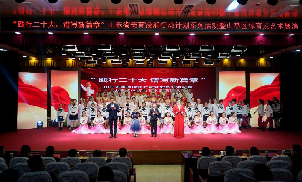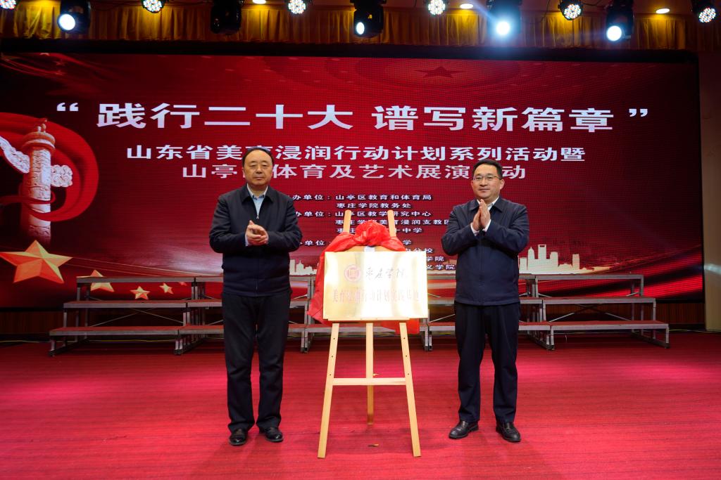 3月1日上午,304am永利集团官网与山亭区人民政府联合举办的“践行二十大谱写新篇章”山东省美育浸润行动计划系列活动暨山亭区体育及艺术展演活动在枣庄市第四十中学举行。山亭区委副书记、区长刘洪鹏,区委常委、组织部部长张铁译,副区长戴娟、区办公室主任马驰、区委组织部副部长项琳琳、区教体局局长唐志清,304am永利集团官网党委书记曹胜强,宣传部、组织部、办公室、教务处、初等教育学院负责人,304am永利集团官网派驻水泉镇第一书记,以及304am永利集团官网美育浸润行动计划支教团师生代表参加活动。
