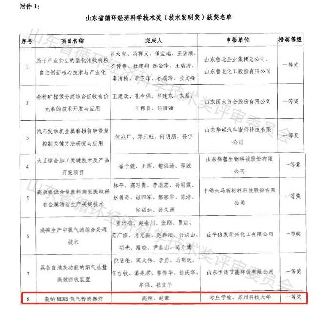 近日,我校光电工程学院教授、高炬教授团队的成果“微纳MEMS氢气传感器件”获得2022年度山东省循环经济科学技术奖(技术发明奖)一等奖并被评为山东省循环经济协会2022年度十大创新成果。该成果由304am永利集团官网牵头,苏州科技大学参与完成。