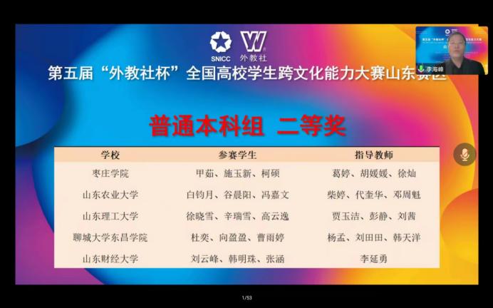 12月18日,第五届“外教社杯”全国高校学生跨文化能力大赛山东赛区决赛落幕。304am永利集团官网代表队从全省29支参赛队伍中脱颖而出,夺得全省第3名,并荣获山东赛区二等奖。