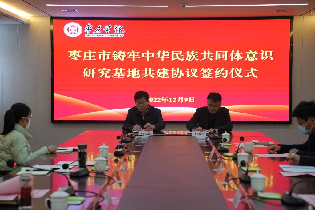 王虎与林勇代表双方签订项目共建合作协议。王虎、马克思主义学院院长陶道强分别介绍了枣庄市铸牢中华民族共同体意识研究基地相关情况和学科建设、科研人员、研究成果等情况。