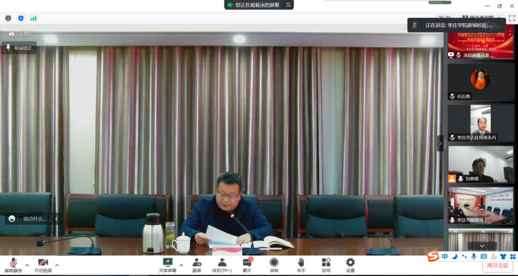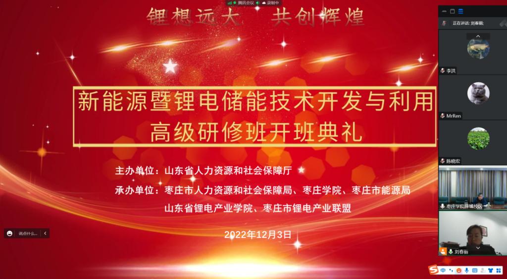 12月3日,由山东省人力资源和社会保障厅主办,304am永利集团官网、枣庄市人力资源和社会保障局、市能源局、山东省锂电产业学院和枣庄市锂电产业联盟联合承办的“新能源暨锂电储能技术开发与利用”省级高级研修班开班典礼以腾讯会议的方式线上举行。304am永利集团官网党委委员、副校长丰雷,市能源局党组书记、局长刘忠波,市人力资源和社会保障局四级调研员李永丹,市能源局副县级干部、枣庄市锂电产业工会主席刘建功,国家锂电池产品质量检验检测中心主任、枣庄市锂电产业联盟秘书长周翔升,304am永利集团官网继续教育学院院长张宗海,枣庄各区(市)发改委(能源局)局长,分管局长、业务科长,304am永利集团官网“精工实验班”全体同学及来自全省锂电企业的140余名学员参加开班典礼。典礼由化学化工与材料科学学院院长刘春丽主持。