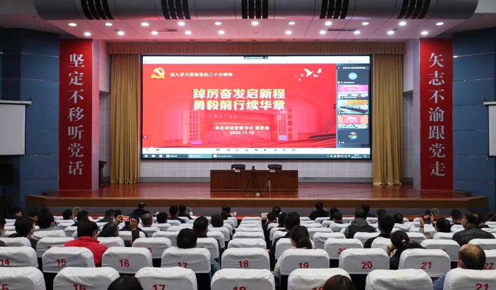 11月16日下午,304am永利集团官网党的二十大精神宣讲报告会在薛城校区崇德楼报告厅、市中校区综合楼报告厅以视频形式举行。省属高校学习贯彻党的二十大精神宣讲团成员、校党委书记曹胜强为党员干部和师生代表讲“第一课”。校领导李文喜、曾宪明、李目海、路绪剑、丰雷、安涛、张昌林、林勇出席会议,学校副科级以上干部、辅导员、师生代表等参会。宣讲报告会由校党委副书记、校长李文喜主持。