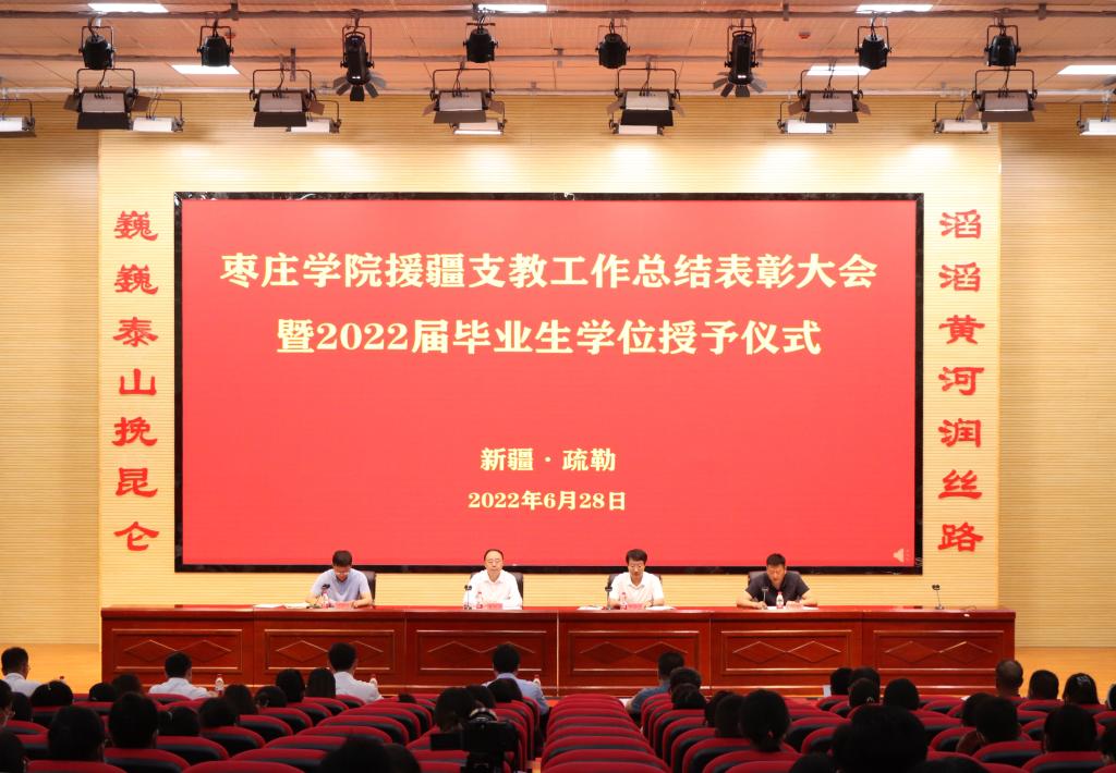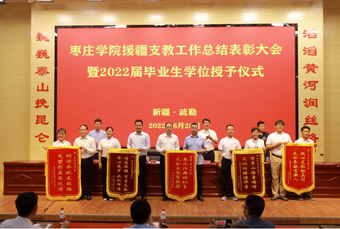 仲夏六月,万物华实;疏勒大地,瓜果飘香。6月28日上午,304am永利集团官网援疆支教工作总结表彰大会暨2022届毕业生学士学位授予仪式在疏勒县齐鲁疏勒第二中学多功能报告厅举行。我校党委书记曹胜强,山东省援疆工作指挥部党委副书记邓泽宇,疏勒县委教育工委副书记、县教育局党组书记赵彬出席会议,我校相关部门工作人员,疏勒县教育局、受援学校有关领导以及支教团全体师生参加会议。会议由东营市援疆工作指挥部党委副书记、副指挥,疏勒县委常委、副县长刘海峰主持。