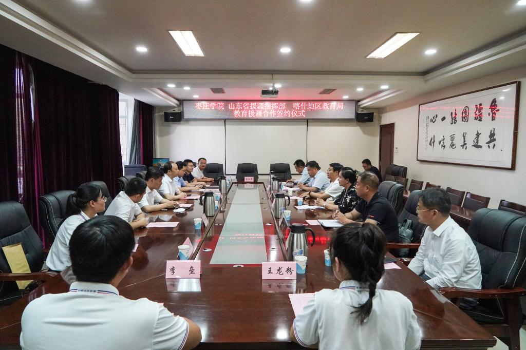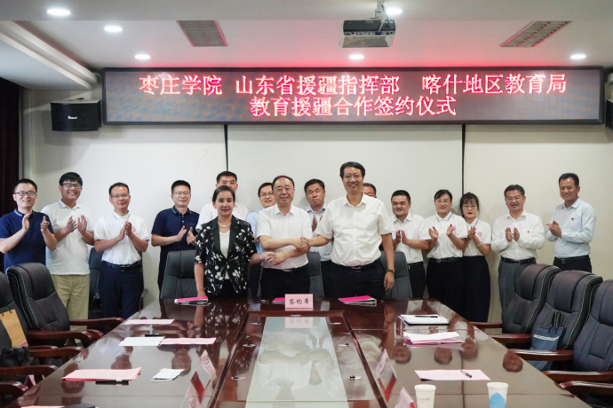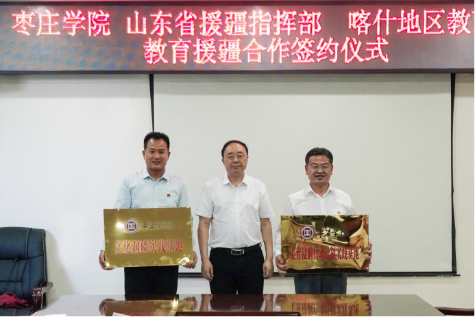 为进一步提高教育援疆精准度、满意度和美誉度,打造教育援疆“枣院品牌”,6月27日下午,我校与山东省援疆指挥部、喀什地区教育局在新疆喀什山东省援疆指挥部二楼会议室举行教育援疆合作签约仪式。304am永利集团官网党委书记曹胜强、山东省援疆工作指挥部党委副书记邓泽宇、喀什地区教育局局长麦尔比亚·玉素甫出席仪式,我校办公室、教务处、宣传部负责同志,马克思主义学院教师代表,东营市援疆指挥部代表、受援学校代表和我校援疆支教团带队教师参加活动。仪式由山东省援疆工作指挥部干部人才组副组长,喀什地区教育局党组成员、副局长刘可宁主持。