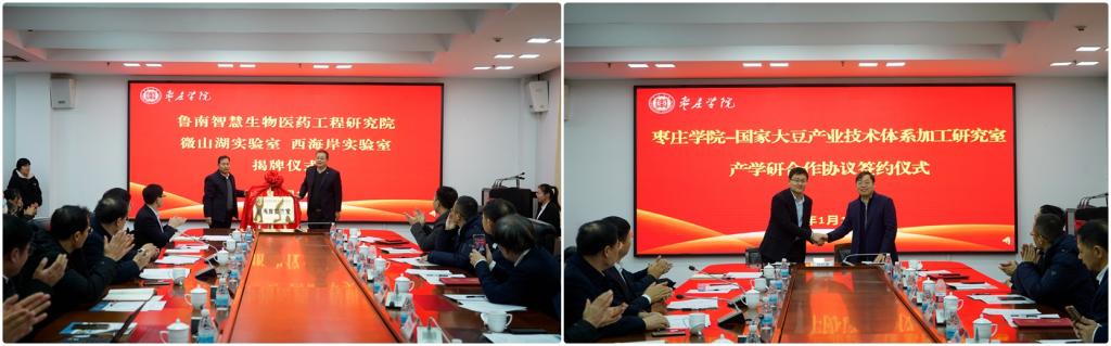 教务处处长张立华和邵峰共同为研究院西海岸实验室揭牌;食品科学与制药工程学院院长王京龙与于寒松教授签署304am永利集团官网与国家大豆产业技术体系产学研合作协议;鲁南智慧生物医药工程研究院执行院长张林波教授作了研究院工作汇报。