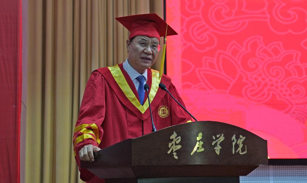 化学化工与材料科学学院2018级毕业生魏一诺作为优秀毕业生代表发言,回顾了在枣院学习生活的点点滴滴,并代表全体毕业生郑重承诺:将始终践行“兼爱尚贤、博物戴行”之校训,立大志、明大德、成大才、担大任。数学与统计学院2019级学生宋鹏伟作为在校生代表发言,表示将以学长为榜样,坚定前进信心,不负青春韶华,书写新的华彩篇章。人工智能学院团总支书记李利苹作为教师代表发言,为全体毕业生送上了最真挚的祝福,并勉励他们要始终拥有精神生活、始终坚持独立思考。