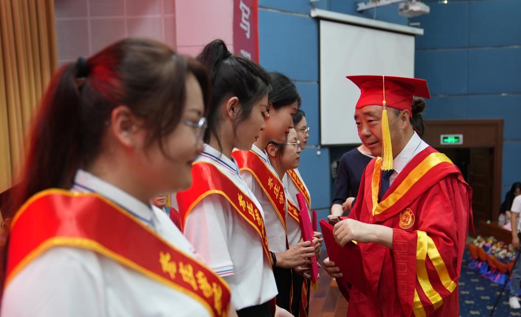 随后,116名毕业生代表满怀书山跋涉的喜悦,在欢快的音乐声中走上主席台,校党委副书记、校长李文喜依次为他们拨穗正冠、颁发学士学位证书并合影留念。