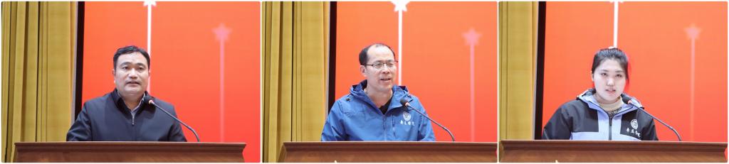外国语学院党总支书记盛清银代表支教团派出学院发言,表示各二级学院积极响应学校党委号召,按照学校总体部署,加强宣传,精心组织,圆满完成了一批又一批选派优秀学生和带队教师的光荣任务,以实际行动弘扬了志愿精神,推进了文化润疆工作。支教团团长张怒代表带队教师发言,表示将坚定信念,铭记初心,共同担负起“文化润疆、教育援疆”的时代使命;躬身教坛,关注学生全面发展,不断提高教书育人本领;团结进取,涵育奉献精神,圆满完成援疆支教工作。心理与教育科学学院徐子娇同学代表支教团学生郑重承诺,将会坚定政治方向,认真履行支教职责,在教学实践中不断提高自身专业素养和教育教学水平,用爱导航,让梦起飞,为新疆的孩子们带去知识与希望。