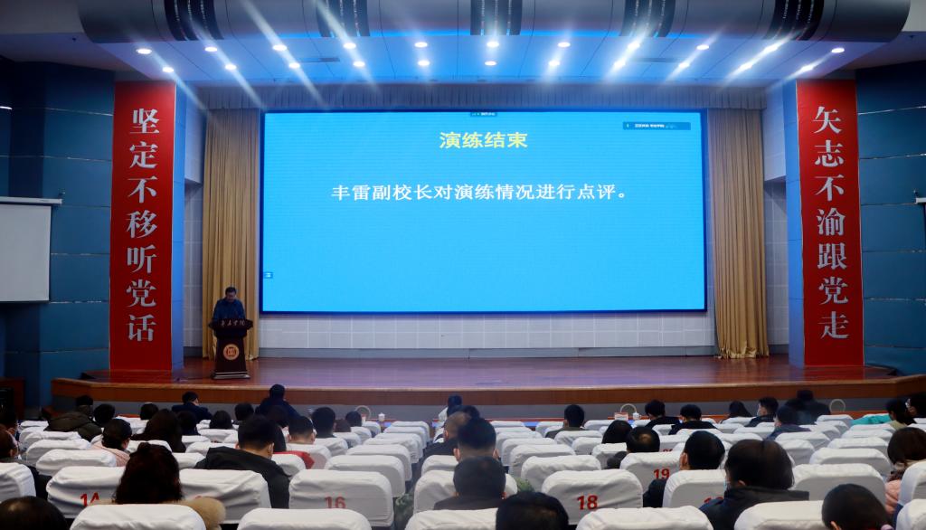 学校疫情防控工作领导小组办公室全体成员,相关部门负责人,各学院党总支副书记,全体辅导员在市中校区报告厅通过视频观摩了整场演练。