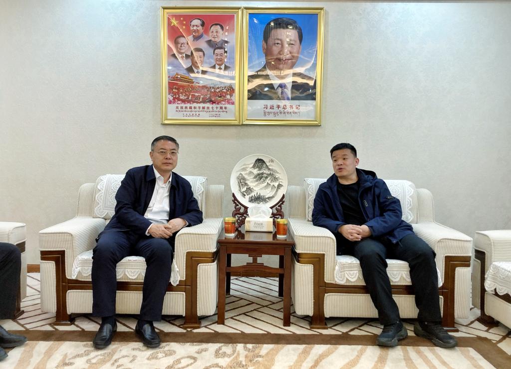 西藏校友联络处成立仪式结束后,高峰一行到山东援藏指挥部进行走访,与山东省第十批援藏干部副领队、日喀则市委组织部副部长李准就山东援藏工作有关情况进行交流。