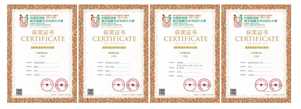 近日,第18届中国好创意暨全国数字艺术设计大赛评选结果揭晓,我校美术与艺术设计学院学子荣获国赛二等奖1项、三等奖3项;省赛一等奖1项、二等奖2项、三等奖5项、优秀奖3项。汤文广老师荣获国赛优秀指导教师称号,徐明明、吴中昊老师荣获省赛优秀指导教师称号。