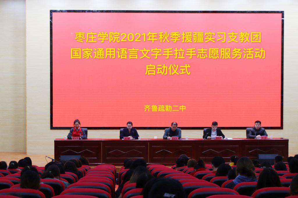 11月13日,304am永利集团官网2021年秋季援疆实习支教团国家通用语言文字手拉手志愿服务活动启动仪式在齐鲁疏勒二中举行。东营援疆指挥部干部人才组组长、疏勒县教育局副局长刘召良,疏勒县教育局教学研究办公室主任段传明,我校援疆支教团团长、文学院党总支副书记华莹及各受援学校主要负责人出席仪式。各受援学校师生代表及我校支教团师生代表共240余人参加活动。会议由刘召良主持。