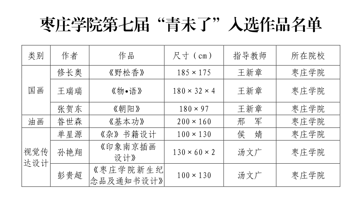 近日,由省文化和旅游厅、省教育厅联合主办的第七届“青未了——山东省高等学校美术院系应届毕业生优秀作品展”复评、评奖活动在山东美术馆举办,我校美术与艺术设计学院选送的10件2021届毕业生毕业设计作品有7件入选,其中国画作品3件、油画作品1件、视觉传达设计作品3件,入选数量居省内同类本科院校前列。