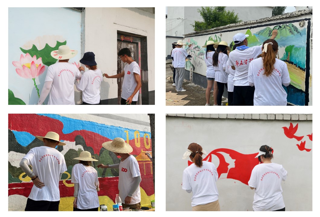 活动期间,来自美术与艺术设计学院和传媒学院的近百名志愿者深入山亭区和滕州市部分乡村,结合所学专业知识和乡村实际,融合党史学习教育和地方红色文化资源,通过墙绘形式,绘制一系列以“党建党史”“美丽乡村”“乡村振兴”等为主题的墙绘作品。墙绘作业过程中,志愿者们不畏炎热,在平均35℃的室外环境下认真构图、起形、涂色、勾边、找细节,一幅幅生动活泼、图文并茂的作品,不仅宣传了党的光辉历史,也成为美丽乡村一道道独特的红色风景。截至目前,服务队累计绘制墙绘作品近百面共2000余平方。