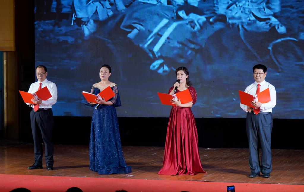 现场,歌声、掌声如潮。师生们的歌声或旋律激昂、气势澎湃,或婉转悠扬、韵味典雅,辅以绚丽多彩的服装和舞台设计,融合优美的舞蹈表演为观众奉上了一场精彩的视听盛宴。嘹亮的歌声回荡在上空,台上演员们深情放歌,台下观众也情不自禁地跟着一起唱和。演出最后,雄壮激昂的音乐再次响起,全体人员一起挥舞手中的党旗,学校领导走上舞台,带领现场师生齐声高唱《没有共产党就没有新中国》,用歌声抒发着对党的感恩之情和庆祝建党百年华诞的喜悦之情,也唱出了担当新使命、奋进新时代的最强音。