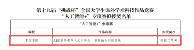 近日,在共青团中央、中国科协、教育部、中国社会科学院、中国工程院、全国学联和江苏省人民政府共同主办的第十九届“挑战杯”全国大学生课外学术科技作品竞赛“人工智能+”专项赛中,由我校美术与艺术设计学院教师吴中昊、王笑然、汤文广指导,金长欣、王怀龙、金志轩、孔萌同学完成的作品《AI赋能的老年人反诈平台——智防融合创新实践》荣获全国二等奖,实现了我校在“人工智能+”赛道国家级奖项零的突破。