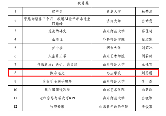 大赛启动以来,校团委高度重视,光电工程学院团委积极统筹推进,通过广泛宣传动员、定向组织辅导等方式,在全校范围内营造了良好的创作参赛氛围。参赛作品紧扣时代脉搏,深入挖掘齐鲁文化内涵,在叙事结构、人物塑造与主题表达上体现出鲜明的地域特色与创新意识。学生将青春视角与地域文化的现代表达相融合,创作出一批兼具思想深度与艺术感染力的剧本,充分彰显了我校在创新型人才培养方面的扎实成效。