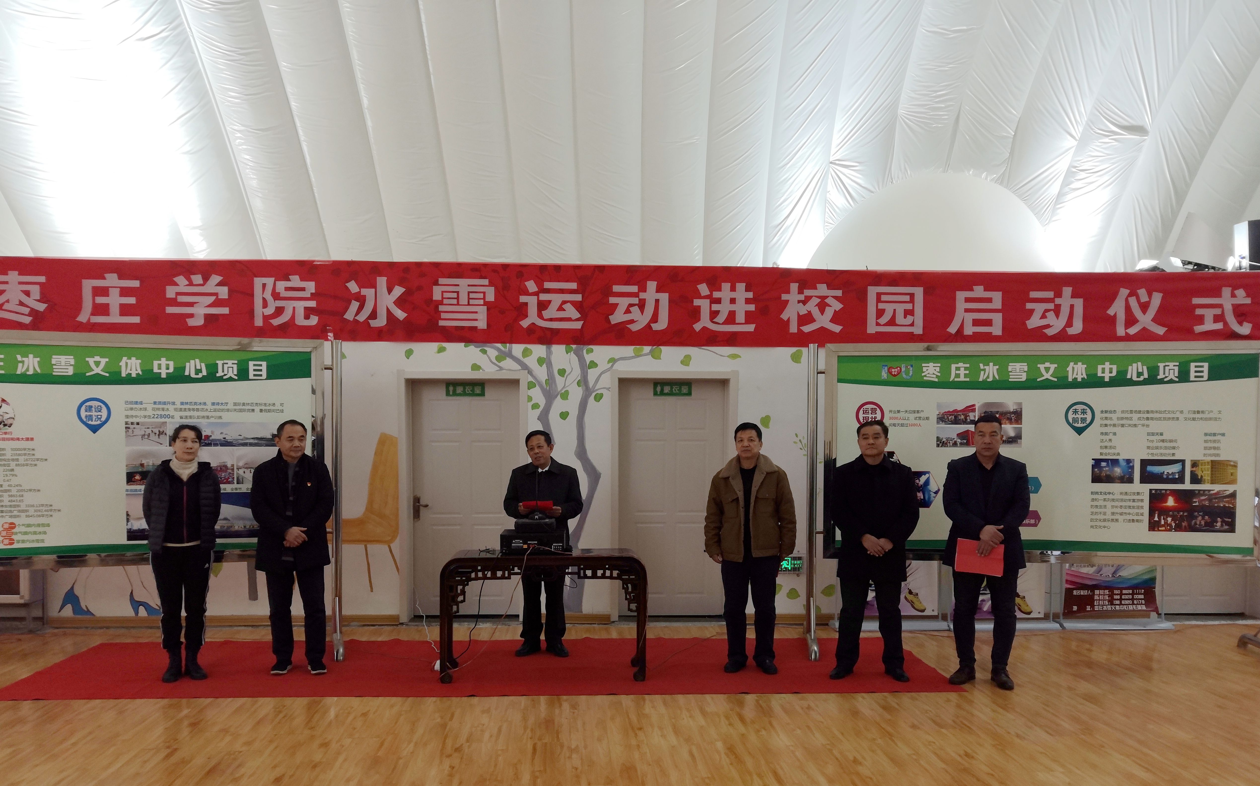 12月28日下午,我校在枣庄冰雪文体中心举行“冰雪运动进校园”启动仪式,校党委委员、副校长明清河出席仪式并讲话,枣庄文投泛华冰雪体育文化发展有限公司总经理孙峰、体育学院党政负责人及师生代表70余人参加活动。