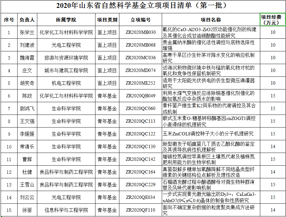 近日,山东省科技厅下发《关于下达2020年度省自然科学基金项目(第一批)的通知》(鲁科字[2020]127号)、《关于下达2020年度省自然科学基金项目(第二批)的通知》(鲁科字[2020]128号),我校共获批立项2020年度山东省自然科学基金19项,其中重点项目4项、面上项目5项、青年项目10项,立项经费总额达317万元,立项数及经费总额均实现历史性突破。