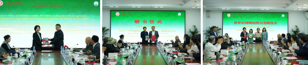 发布会期间,我校向中华全协、韩国世协、韩国柴门霍夫学堂、枣庄市档案馆、枣庄市图书馆、枣庄市荀子研究会赠送中世双语《荀子》新书,并分别向枣庄市档案馆、枣庄市图书馆赠送世界语档案史料及图书。韩国世协、韩国柴门霍夫学堂向我校赠送世界语图书。