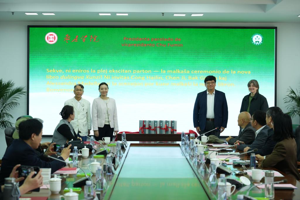 4月22日,中世双语《荀子》新书发布会暨中韩世界语座谈会在市中校区综合楼三楼会议室举行。中国外文局亚太传播中心世界语部主任、中华全国世界语协会秘书长陈吉,校党委副书记、校长丛海林,党委委员、副校长褚夫敏,党委委员、宣传部部长闫昕出席会议。